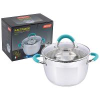 упаковка - цветная коробка. Корпус кастрюли дополнительно упакован в пакет, крышка в пузырчатую пленку, ручки защищены доп упаковкой.